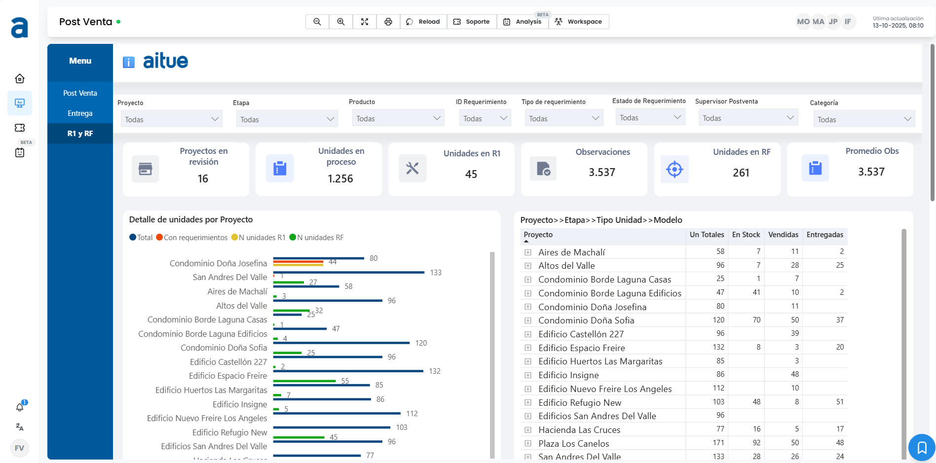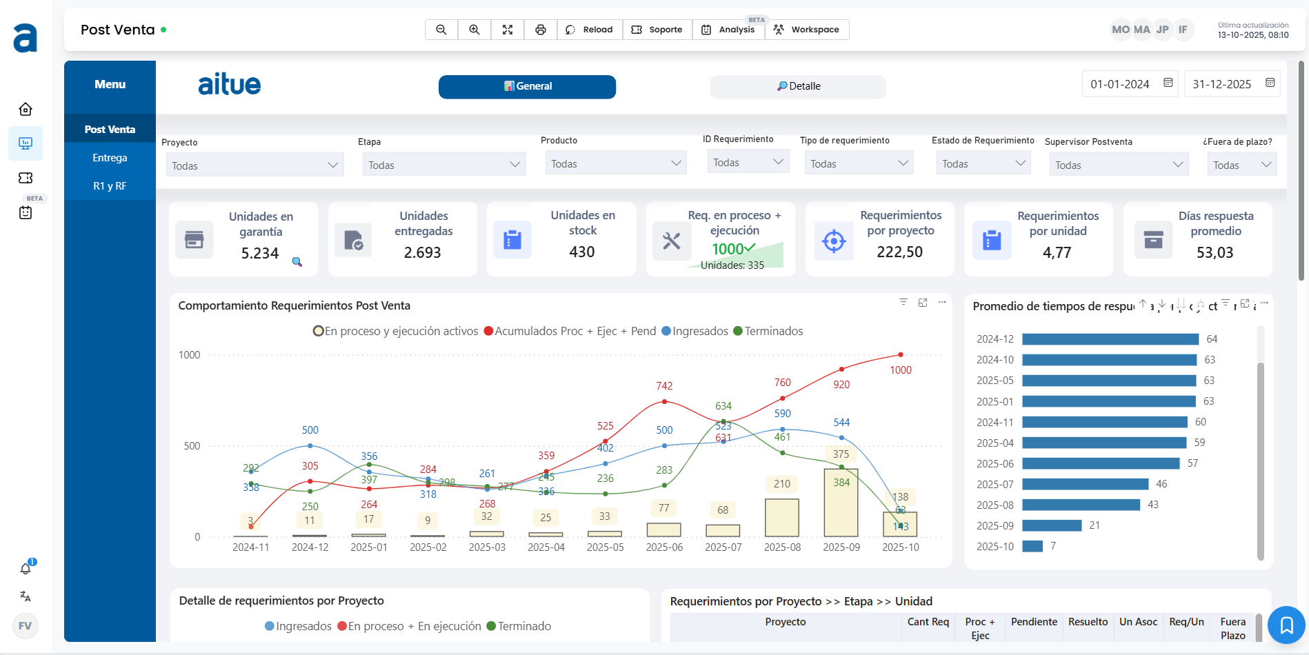El nuevo Dashboard de Postventa representa un salto en la manera en que Aitue gestiona y analiza su información. Diseñado para integrar todos los datos relevantes del área, desde observaciones y tiempos de atención hasta stock y recurrencias, lo que permite visualizar el desempeño en tiempo real y acceder a indicadores de gestión de forma simple y ordenada.